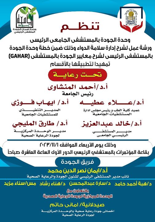 تأتي الورشة في إطار خطة وحدة الجودة بالمستشفى الجامعي الرئيسي لشرح معايير الجودة بالمستشفى(GAHAR)، تمهيدا لتطبيقها بالأقسام.