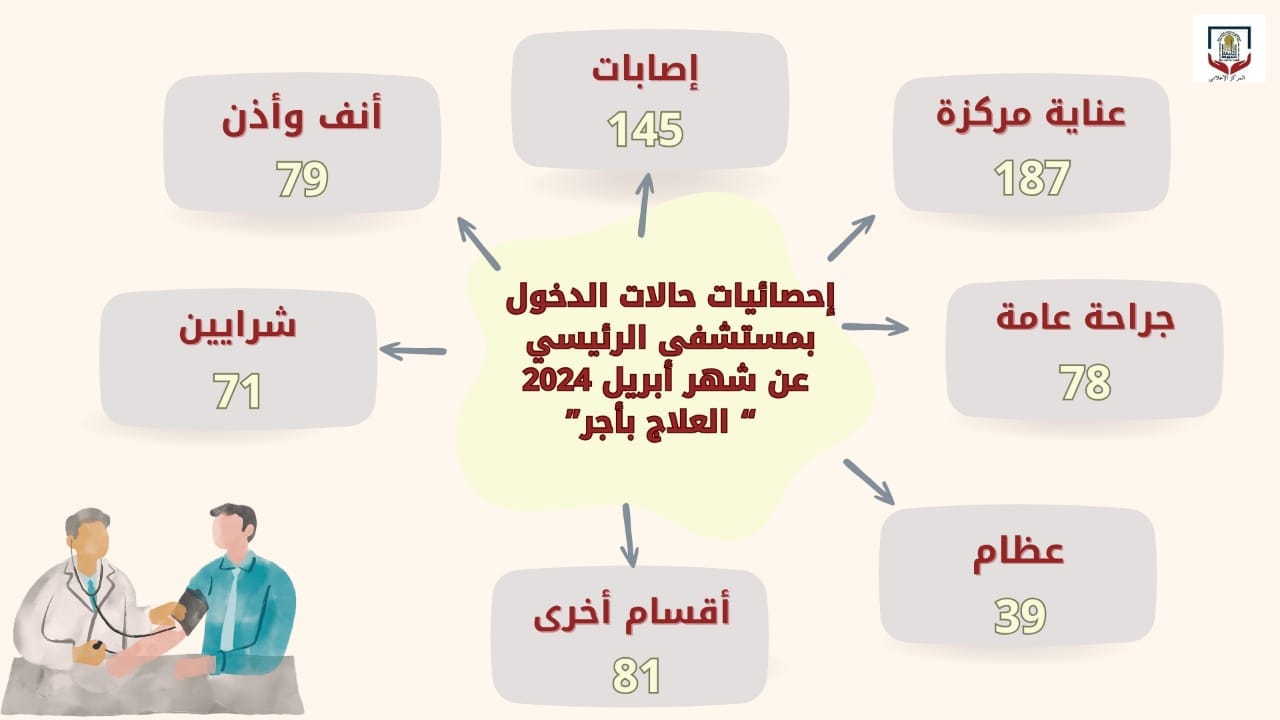 كما تم استقبال (187) حالة دخول بالعناية المركزة، و(145) حالة دخول بقسم الإصابات، و(79) حالة بقسم جراحة الأنف والأذن والحنجرة، و(78) حالة بقسم الجراحة العامة، إلى جانب تسجيل و(71) حالة دخول بقسم الشرايين، و (39) بقسم العظام، بالإضافة إلى تسجيل (81) حالة بالأقسام الأخرى خلال الشهر نفسه.