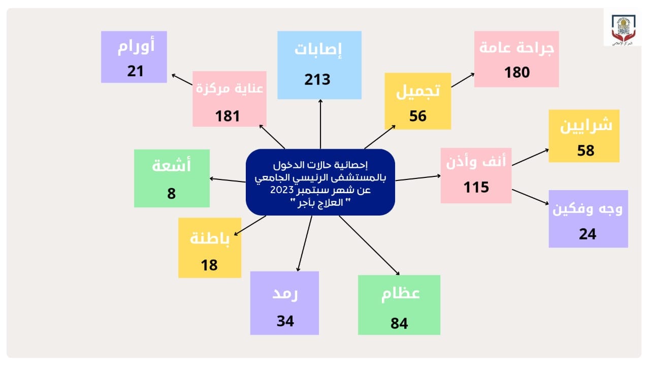 وأعلن المستشفى عن استقبال ٢١٣ حالة دخول بقسم الإصابات، و١٨٠ حالة بقسم الجراحة العامة، و١٨١ حالة دخول بالعناية المركزة، إلى جانب تسجيل ١١٥ حالة دخول بقسم الأنف والأذن والحنجرة، و ٥٨ حالة دخول بقسم الشرايين خلال الشهر نفسه.