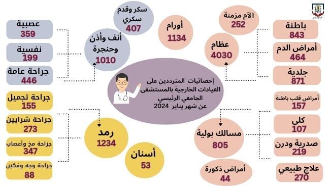 وأعلن المستشفى الرئيسي عن استقبال ٤٠٣٠ حالة دخول بعيادة العظام، و١١٣٤ حالة بعيادة الأورام، و١٠١٠ حالة بعيادة الأنف والأذن والحنجرة، إلى جانب تسجيل ١٢٣٤ حالة بعيادة الرمد، و ٨٤٣ بعيادة الباطنة، و٤٦٤ حالة بعيادة أمراض الدم، و٨٧١ حالة بعيادة الجلدية، و١٥٧ حالة بعيادة أمراض قلب باطنة، و١٠٧ بعيادة الكلى، و٢١٩ حالة بعيادة صدرية ودرن، و٢٧٠ بعيادة العلاج الطبيعي، و٨٠٥ حالة بعيادة المسالك البولية، و٣٥٩ بعيادة العصبية، و١٩٩ بعيادة النفسية خلال الشهر نفسه.