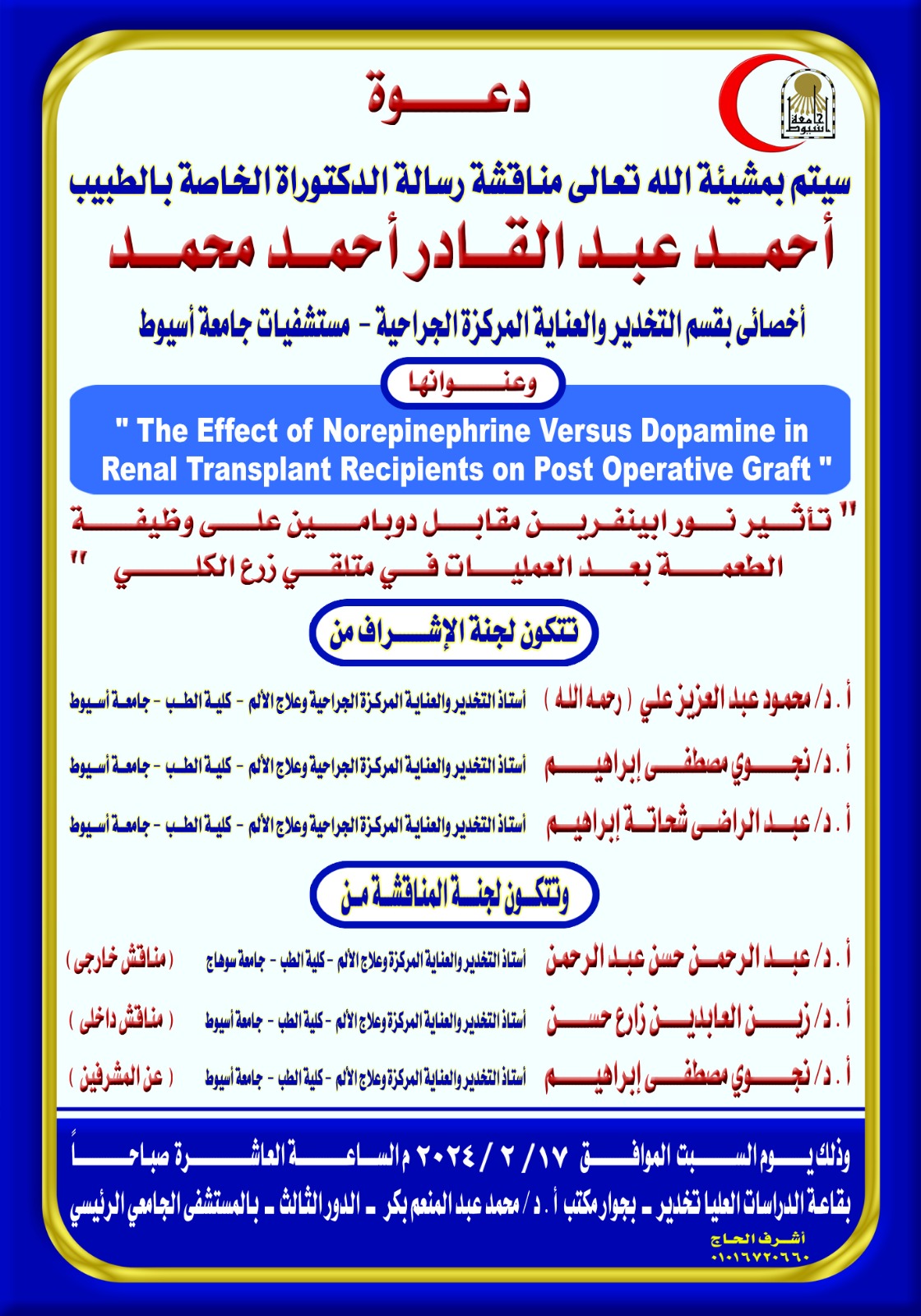 مناقشة رسالة الدكتوراه الخاصة بالطبيب / أحمد عبد القادر أحمد محمد - أخصائى بقسم التخدير والعناية المركزة الجراحية - مستشفيات جامعة أسيوط
