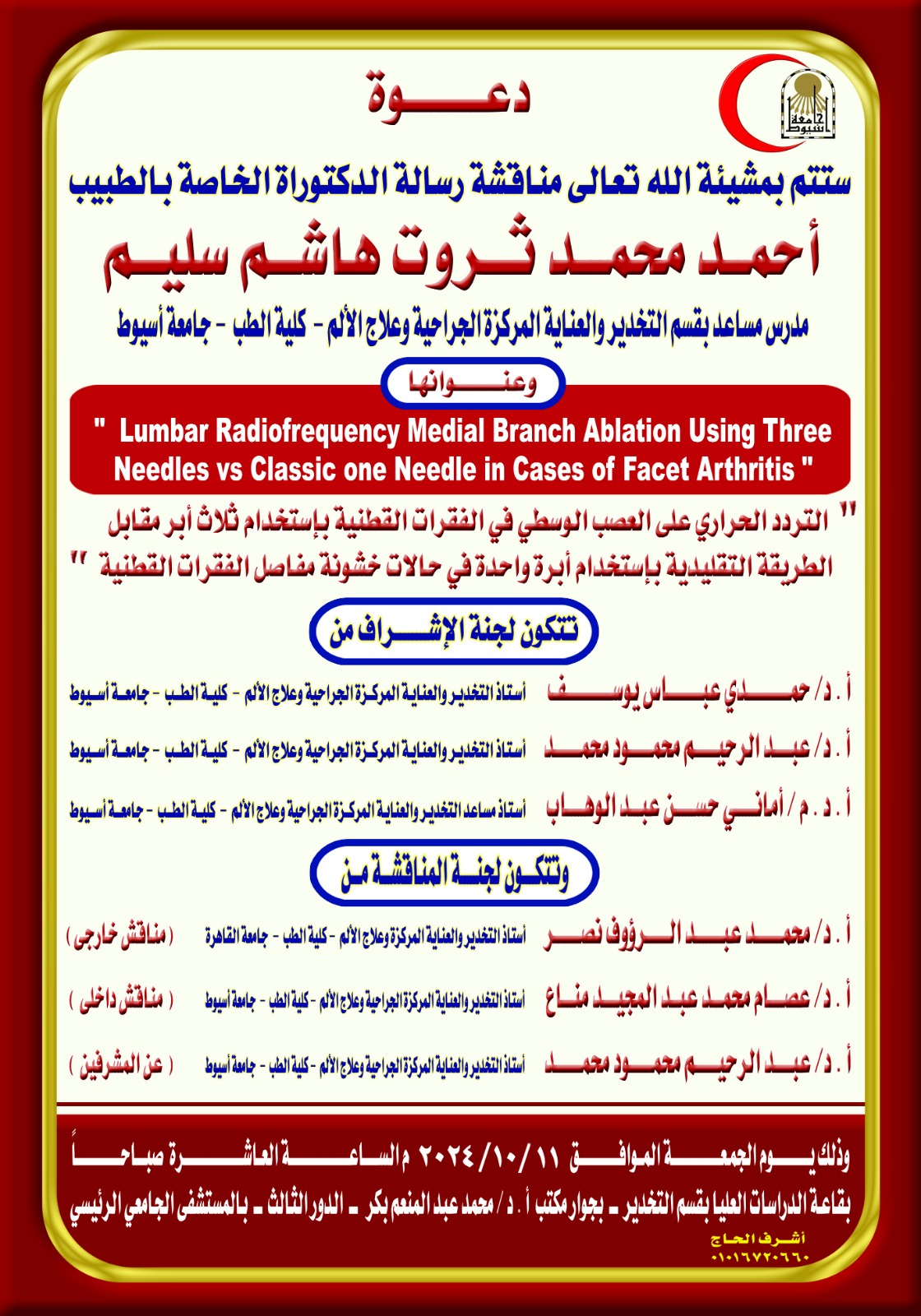 مناقشة رسالة الدكتوراه الخاصة بالطبيب / أحمد محمد ثروت هاشم سليم - مدرس مساعد بقسم التخدير والعناية المركزة الجراحية وعلاج الألم - كلية الطب - جامعة أسيوط