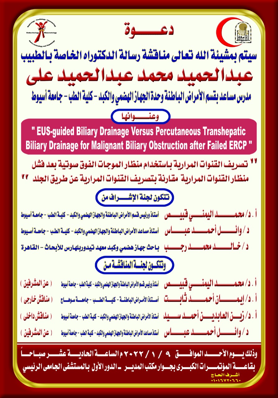 مناقشة رسالة الدكتوراه الخاصة بالطبيب / عبد الحميد محمد عبد الحميد على - مدرس مساعد بقسم الأمراض الباطنة ووحدة الجهاز الهضمى والكبد - كلية الطب - جامعة أسيوط