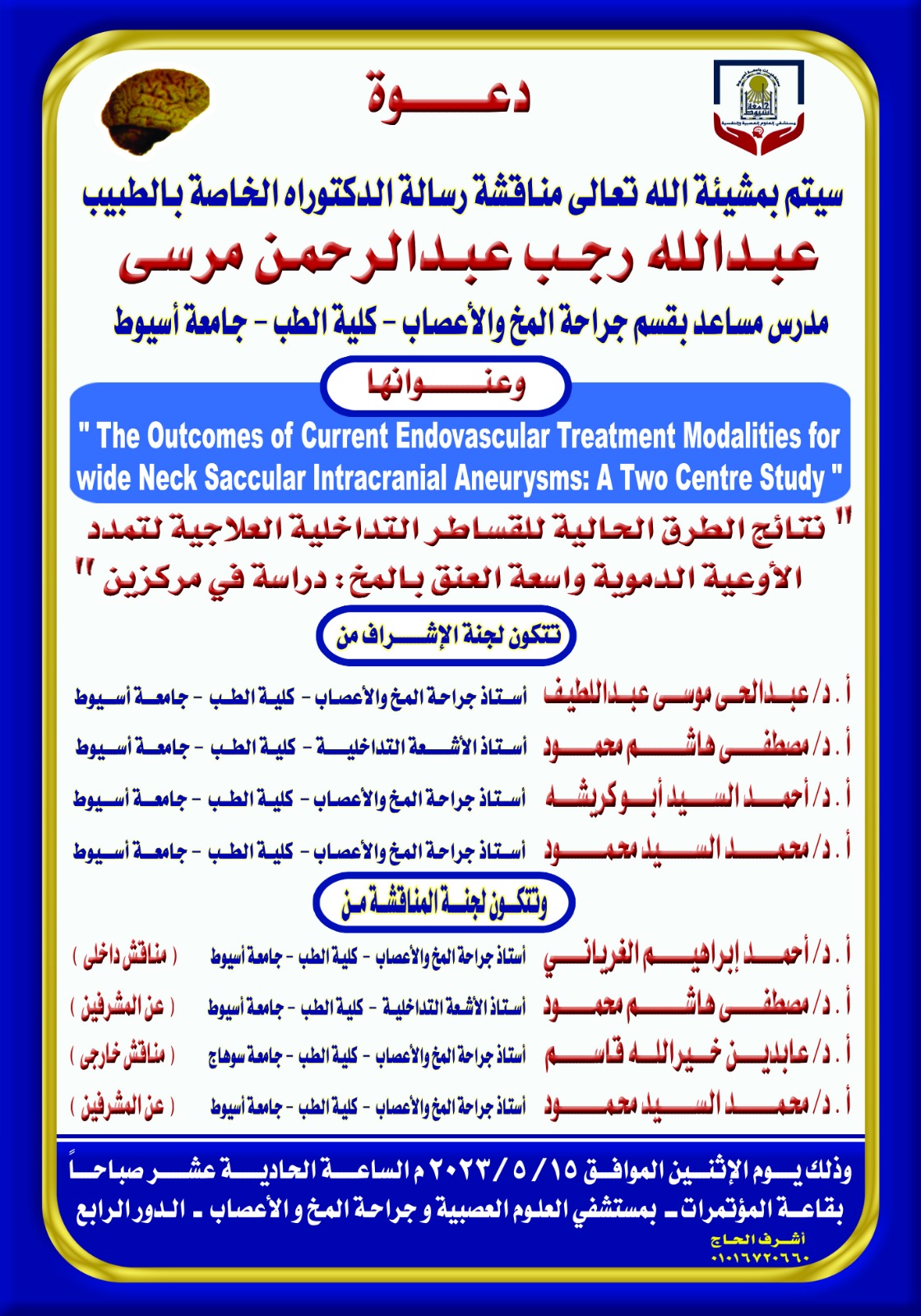مناقشة رسالة الدكتوراه الخاصة بالطبيب / عبدالله رجب عبد الرحمن مرسى - مدرس مساعد بقسم جراحة المخ والأعصاب - كلية الطب - جامعة أسيوط