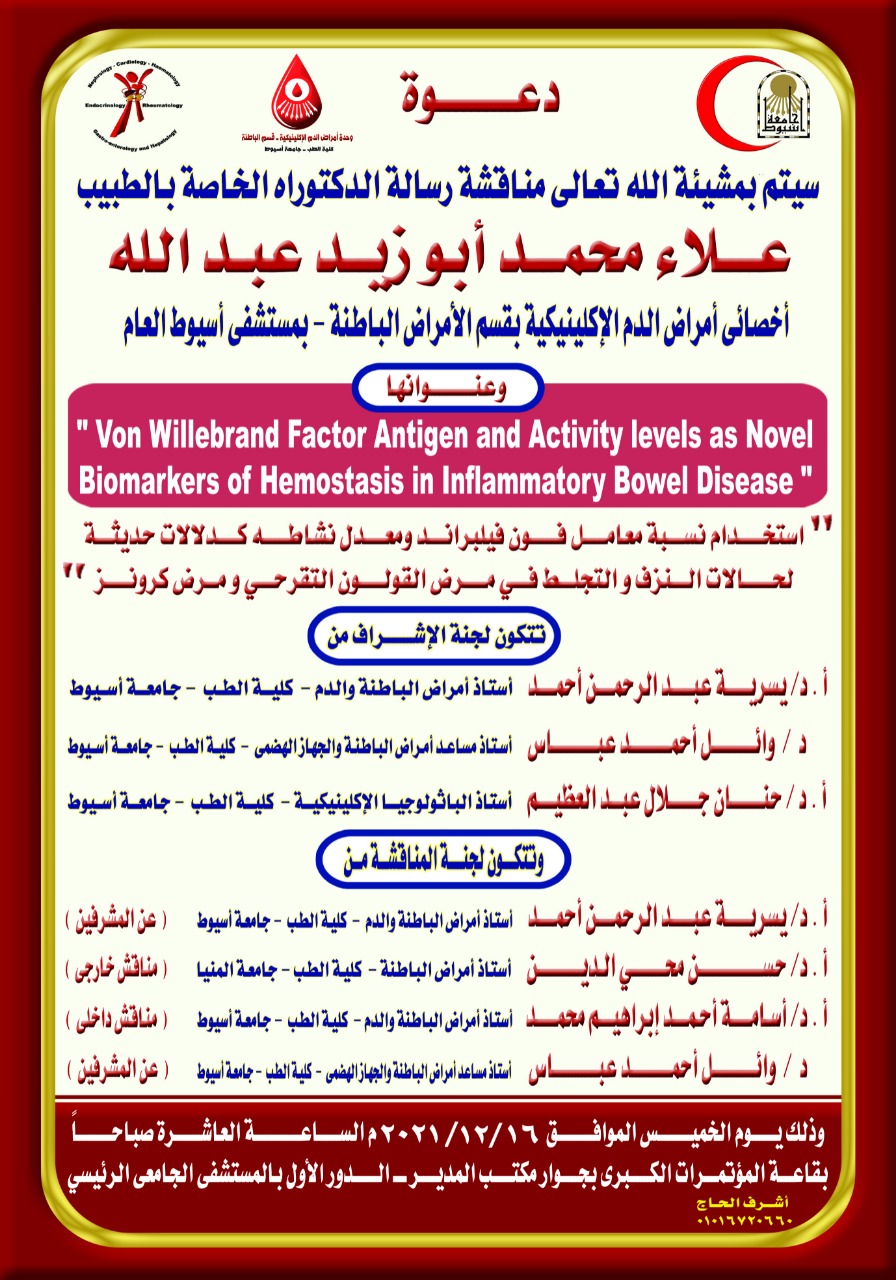 مناقشة رسالة الدكتوراه الخاصة بالطبيب / علاء محمد أبو زيد عبد الله - أخصائى أمراض الدم الإكلينيكية بقسم الأمراض الباطنة - بمستشفى أسيوط العام