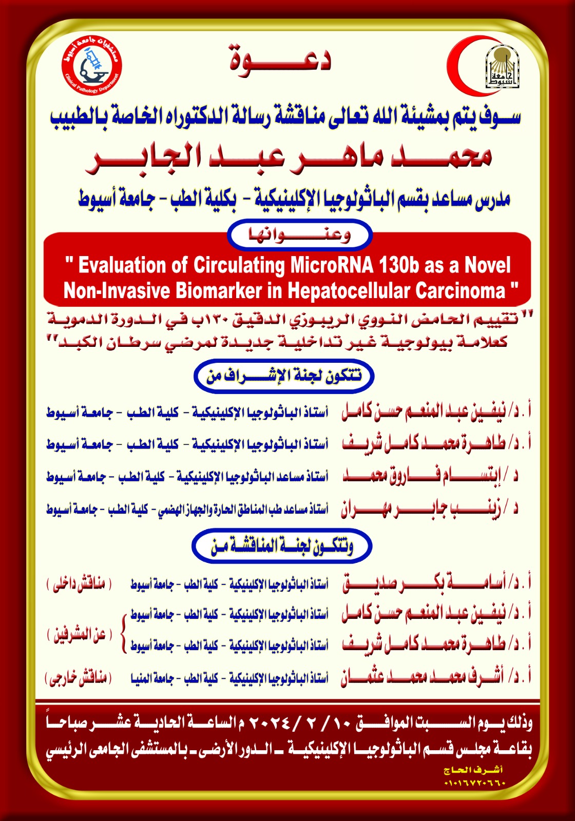 مناقشة رسالة الدكتوراه الخاصة بالطبيب / محمد ماهر عبد الجابر - مدرس مساعد بقسم الباثولوجيا الإكلينيكية - كلية الطب - جامعة أسيوط