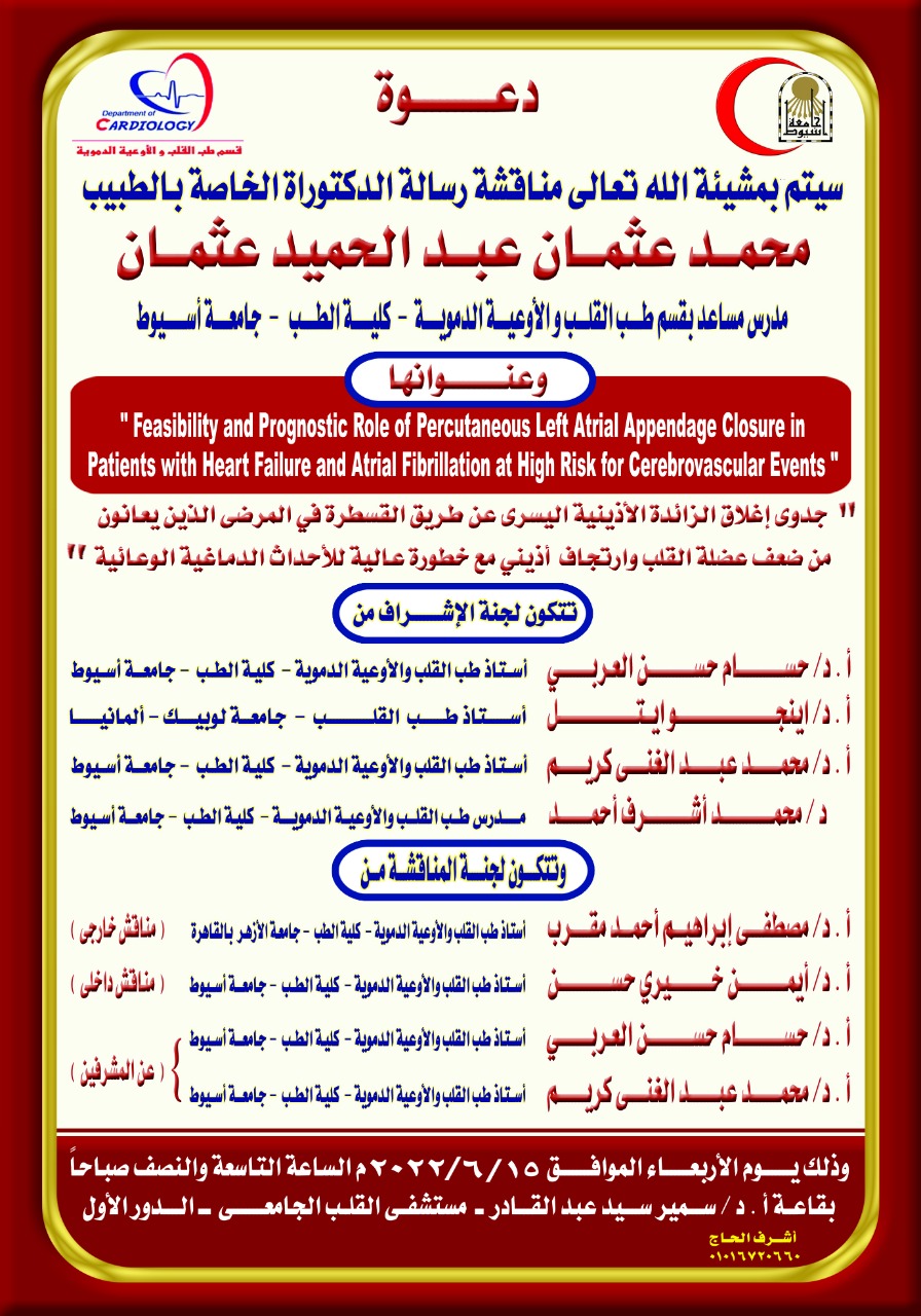 مناقشة رسالة الدكتوراه الخاصة بالطبيب / محمد عثمان عبد الحميد عثمان - مدرس مساعد بقسم طب القلب والأوعية الدموية - كلية الطب - جامعة أسيوط