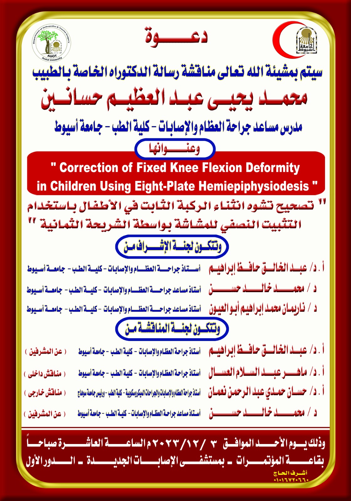 مناقشة رسالة الدكتوراه الخاصة بالطبيب / محمد يحيى عبد العظيم حسانين - مدرس مساعد بقسم جراحة العظام والإصابات - كلية الطب - جامعة أسيوط