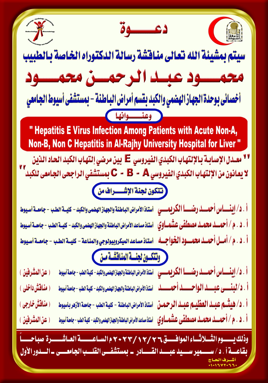مناقشة رسالة الدكتوراه الخاصة بالطبيب / محمود عبد الرحمن محمود - أخصائى بوحدة الجهاز الهضمى والكبد بقسم الأمراض الباطنة - بمستشفى أسيوط الجامعى