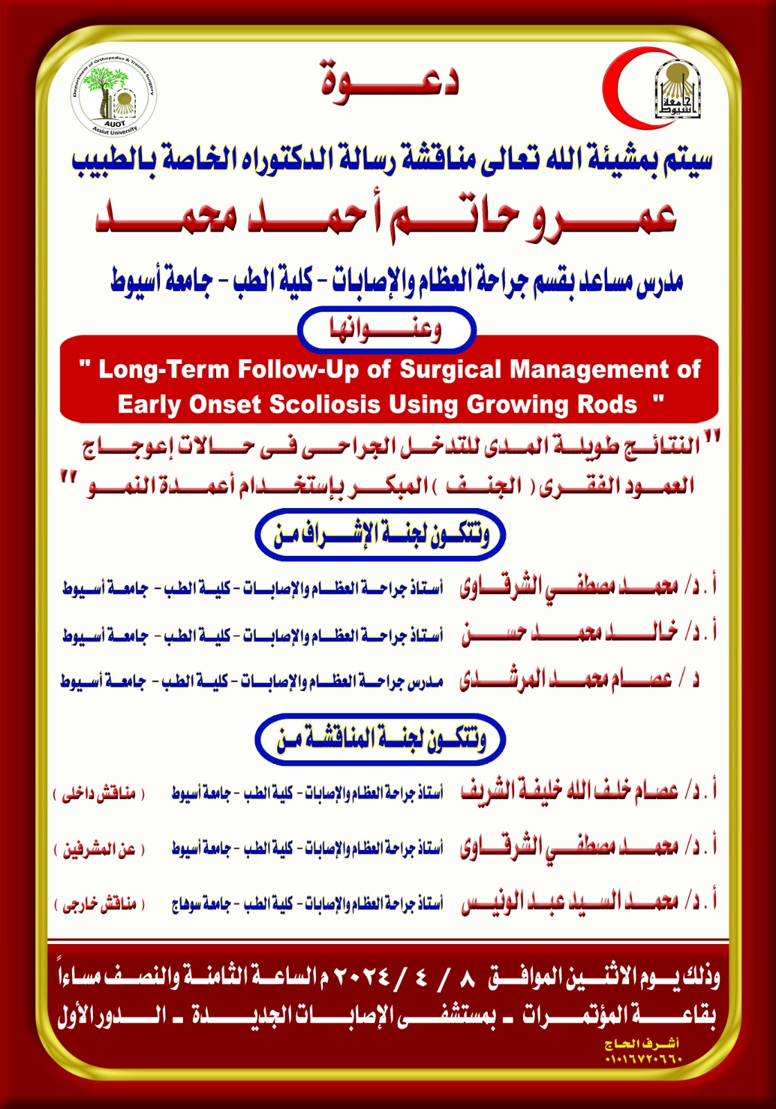 مناقشة رسالة الدكتوراه الخاصة بالطبيب / عمرو حاتم أحمد محمد - مدرس مساعد بقسم جراحة العظام والإصابات - كلية الطب - جامعة أسيوط