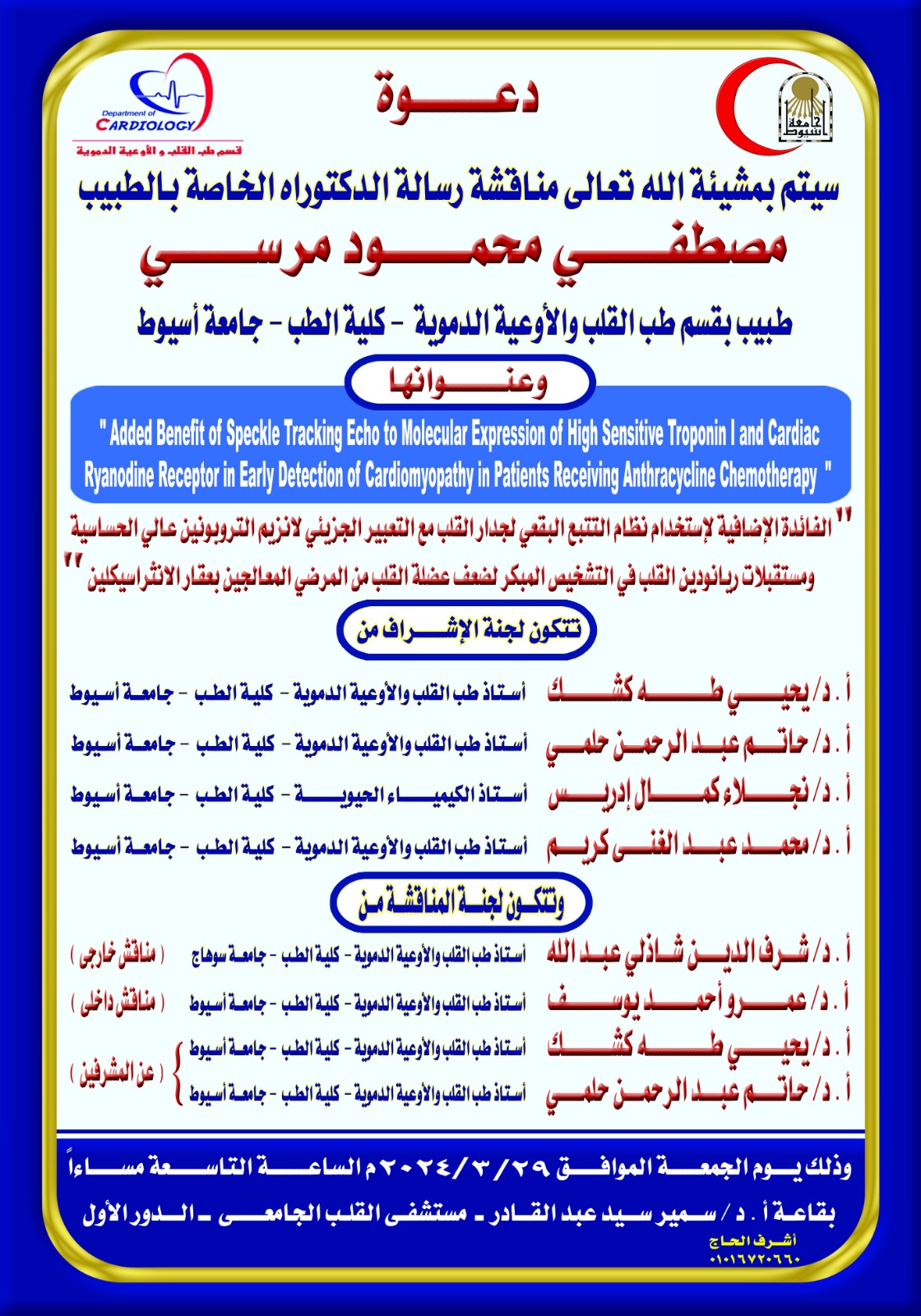 مناقشة رسالة الدكتوراه الخاصة بالطبيب / مصطفي محمود مرسي - طبيب بقسم طب القلب والأوعية الدموية - كلية الطب - جامعة أسيوط