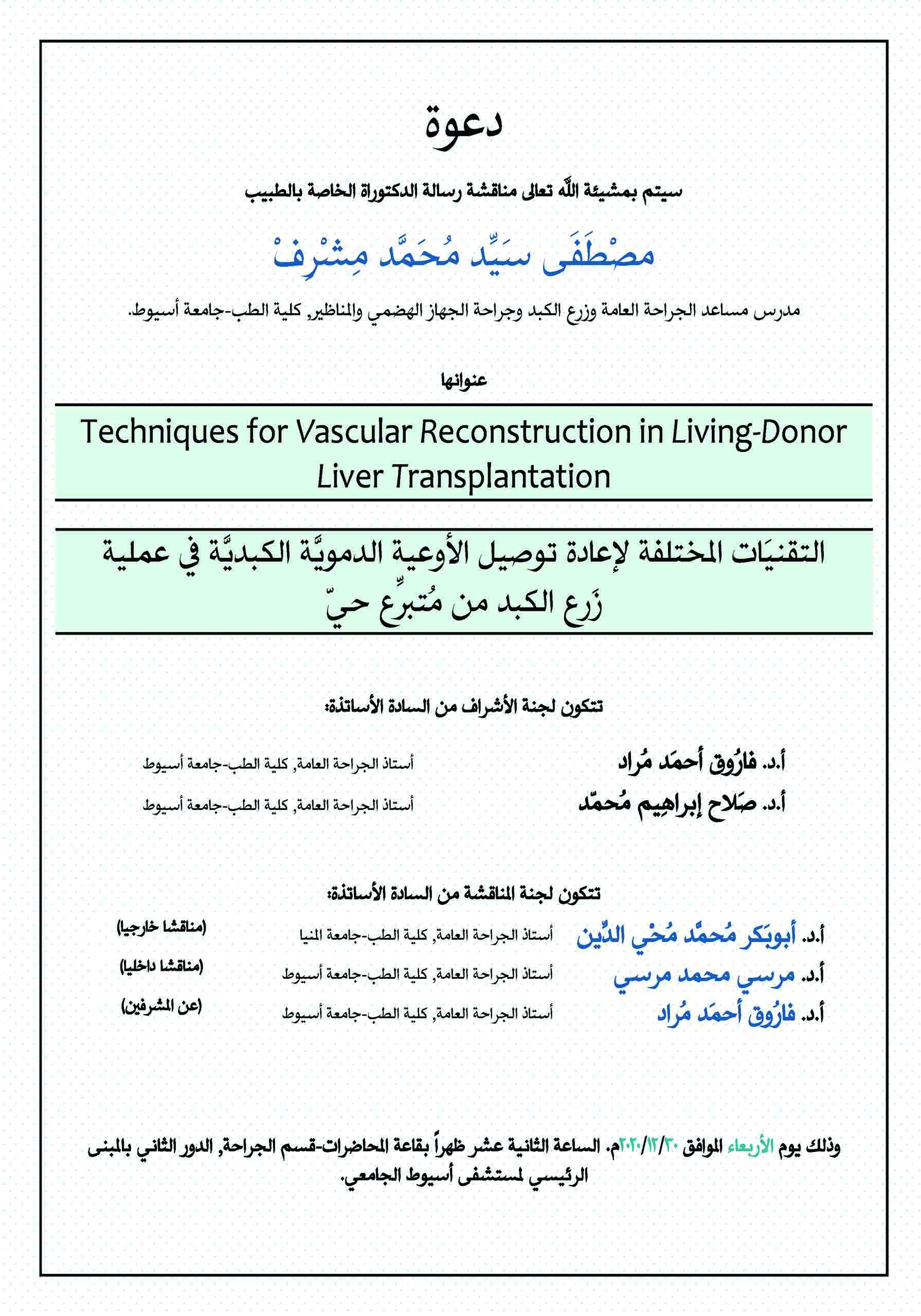 مناقشة رسالة الدكتوراه الخاصة بالطبيب / مصطفى سيد محمد مشرف - مدرس مساعد بقسم الجراحة العامة - كلية الطب - جامعة أسيوط
