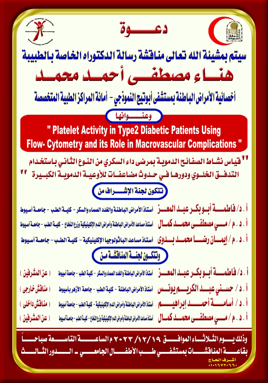 مناقشة رسالة الدكتوراه الخاصة بالطبيبة / هناء مصطفى أحمد محمد - أخصائية الأمراض الباطنة بمستشفي أبو تيج النموذجي - أمانة المراكز الطبية المتخصصة
