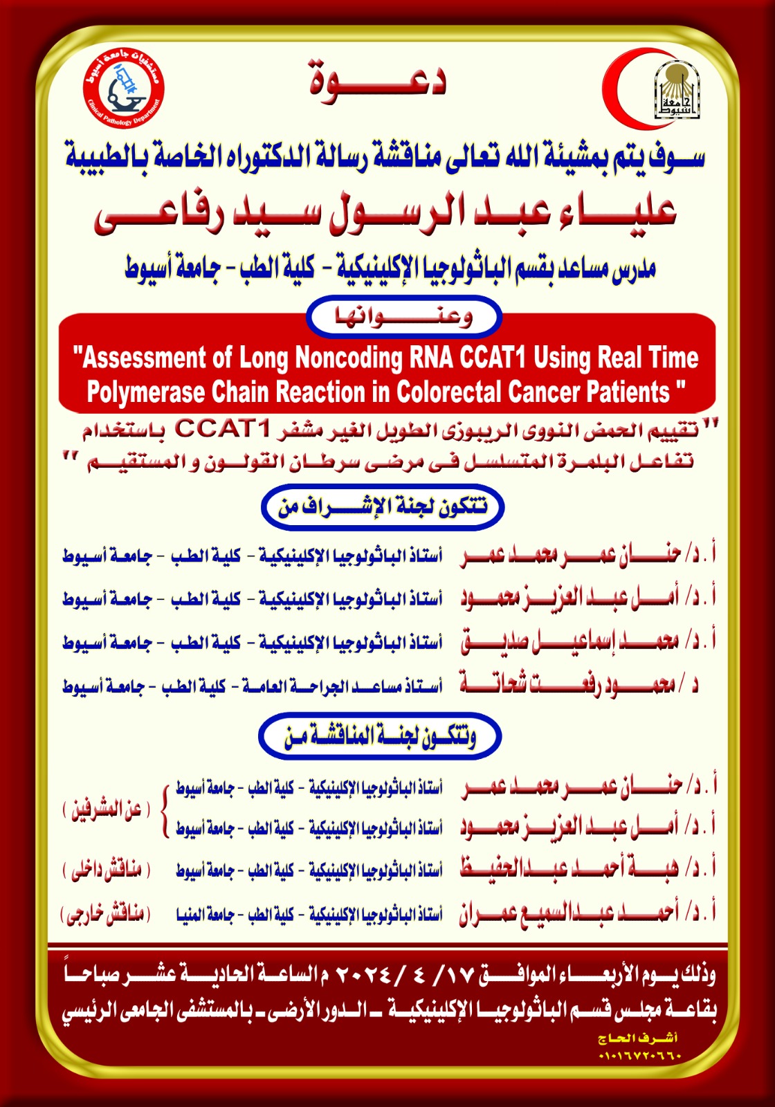 مناقشة رسالة الدكتوراه الخاصة بالطبيبة / علياء عبد الرسول سيد رفاعي - مدرس مساعد بقسم الباثولوجيا الإكلينيكية - كلية الطب - جامعة أسيوط