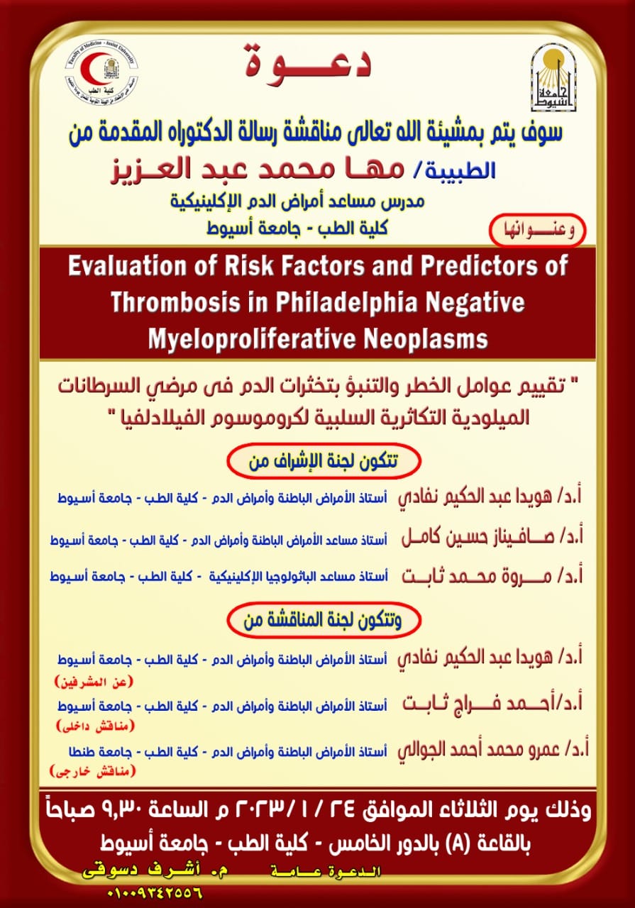 مناقشة رسالة الدكتوراه الخاصة بالطبيبة / مها محمد عبد العزيز - مدرس مساعد بوحدة أمراض الدم الإكلينيكية بقسم الأمراض الباطنة - كلية الطب - جامعة أسيوط