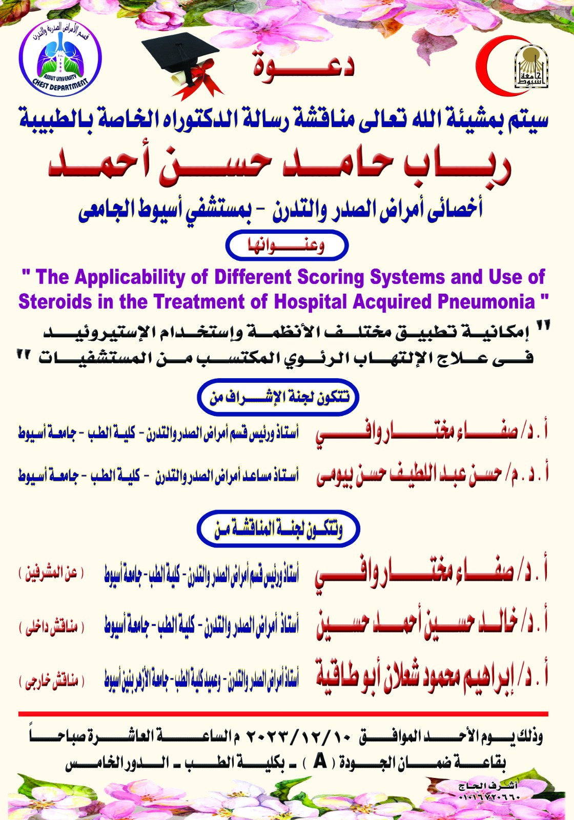 مناقشة رسالة الدكتوراه الخاصة بالطبيبة / رباب حامد حسن أحمد - أخصائى أمراض الصدر والتدرن - كلية الطب - بالمستشفي الجامعى الرئيسي