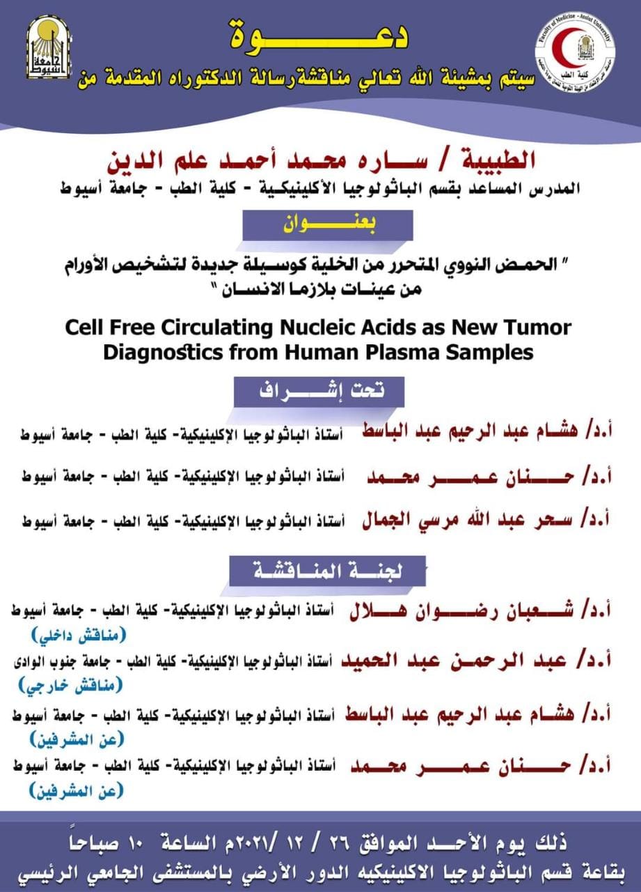 مناقشة رسالة الدكتوراه الخاصة بالطبيبة / سارة محمد أحمد علم الدين - المدرس المساعد بقسم الباثولوجيا الإكلينيكية - كلية الطب - جامعة أسيوط