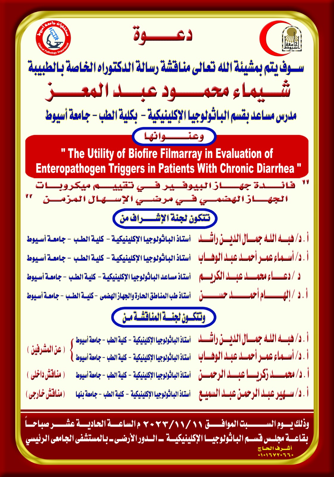 مناقشة رسالة الدكتوراه الخاصة بالطبيبة / شيماء محمود عبد المعز - مدرس مساعد بقسم الباثولوجيا الإكلينيكية - كلية الطب - جامعة أسيوط