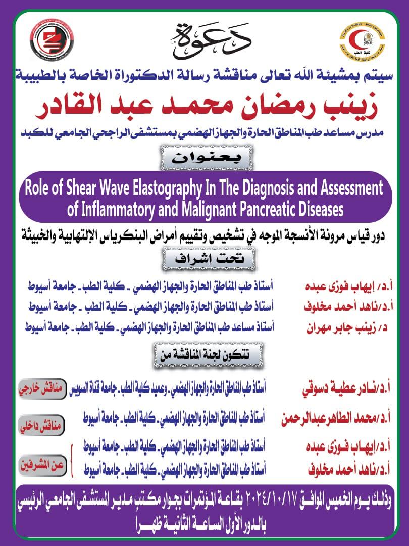 مناقشة رسالة الدكتوراه الخاصة بالطبيبة / زينب رمضان محمد عبد القادر - مدرس مساعد بقسم طب المناطق الحارة والجهاز الهضمي والكبد - كلية الطب - جامعة أسيوط