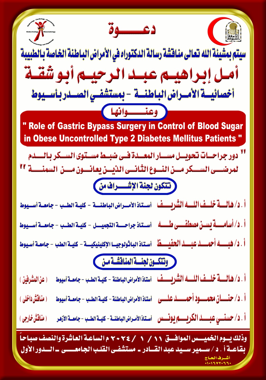 مناقشة رسالة الدكتوراه في الأمراض الباطنة الخاصة بالطبيبة / أمل إبراهيم عبد الرحيم أبو شقة - أخصائية الأمراض الباطنة - بمستشفي الصدر بأسيوط