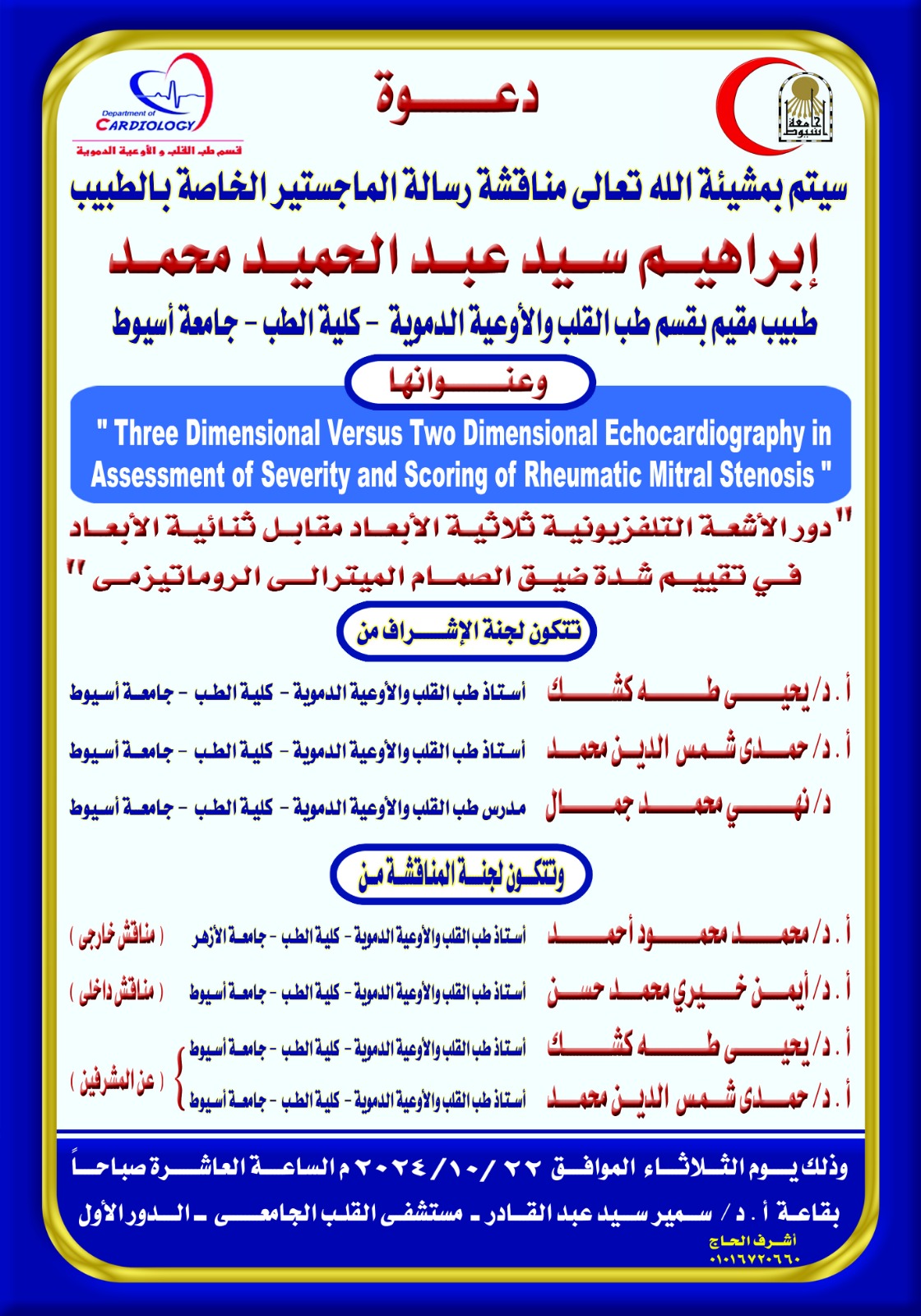 مناقشة رسالة الماجستير الخاصة بالطبيب / إبراهيم سيد عبد الحميد محمد - طبيب مقيم بقسم طب القلب و الأوعية الدموية - كلية الطب - جامعة أسيوط