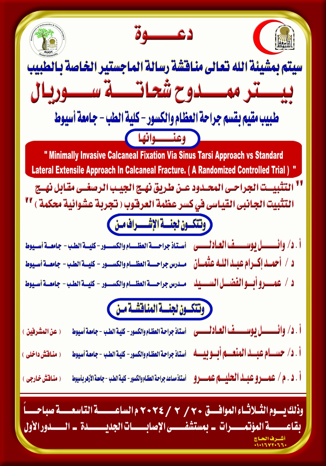 مناقشة رسالة الماجستير الخاصة بالطبيب / بيتر ممدوح شحاتة سوريال - طبيب مقيم بقسم جراحة العظام و الكسور - كلية الطب - جامعة أسيوط
