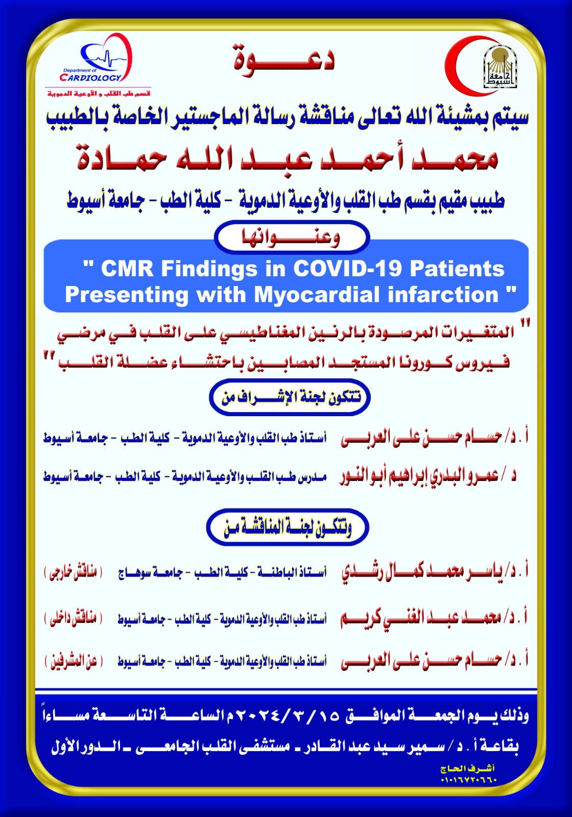 مناقشة رسالة الماجستير الخاصة بالطبيب / محمد أحمد عبد الله حمادة - طبيب مقيم بقسم طب القلب والأوعية الدموية - كلية الطب - جامعة أسيوط