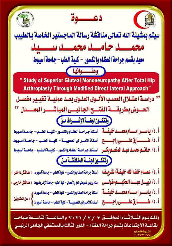 مناقشة رسالة الماجستير الخاصة بالطبيب / محمد حامد محمد سيد - معيد بقسم جراحة العظام – كلية الطب – جامعة أسيوط