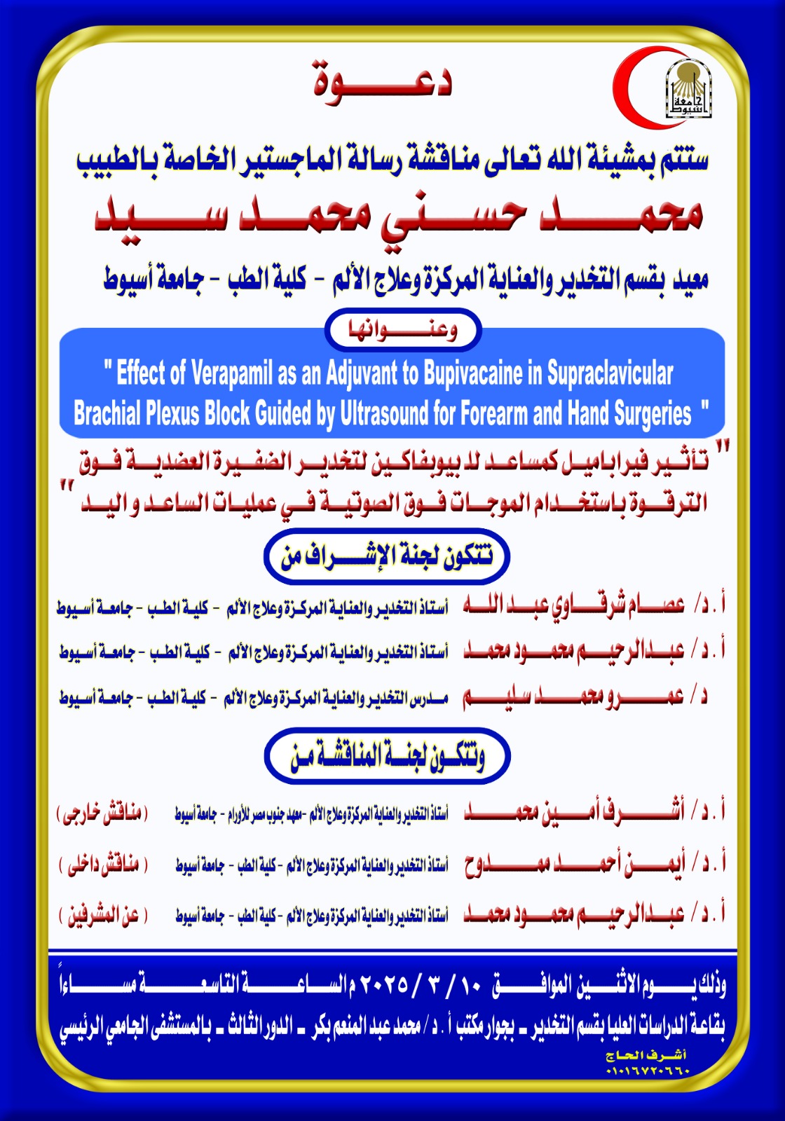 مناقشة رسالة الماجستير الخاصة بالطبيب / محمد حسني محمد سيد - معيد بقسم التخدير والعناية المركزة وعلاج الألم - كلية الطب - جامعة أسيوط