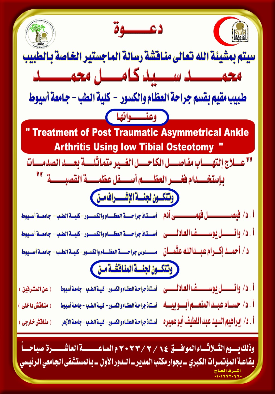 مناقشة رسالة الماجستير الخاصة بالطبيب / محمد سيد كامل محمد - طبيب مقيم بقسم جراحة العظام والكسور - كلية الطب - جامعة أسيوط