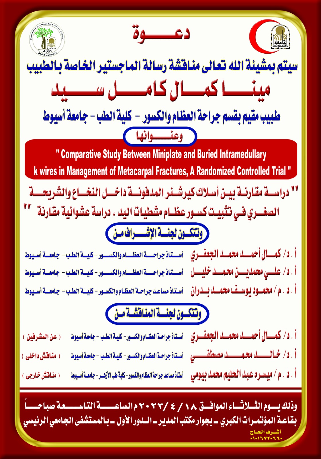 مناقشة رسالة الماجستير الخاصة بالطبيب / مينا كمال كامل سيد - طبيب مقيم بقسم جراحة العظام والكسور- كلية الطب- جامعة أسيوط