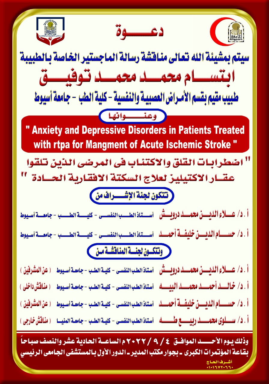 مناقشة رسالة الماجستير الخاصة بالطبيبة / ابتسام محمد محمد توفيق - طبيب مقيم بقسم الأمراض العصبية والنفسية - كلية الطب - جامعة أسيوط