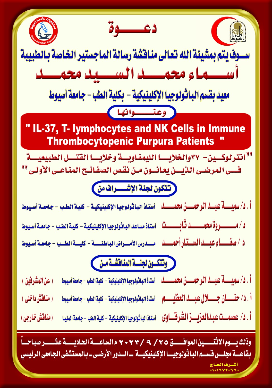 مناقشة رسالة الماجستير الخاصة بالطبيبة / إسراء محمد السيد محمد - معيد بقسم الباثولوجيا الإكلينيكية - كلية الطب - جامعة أسيوط