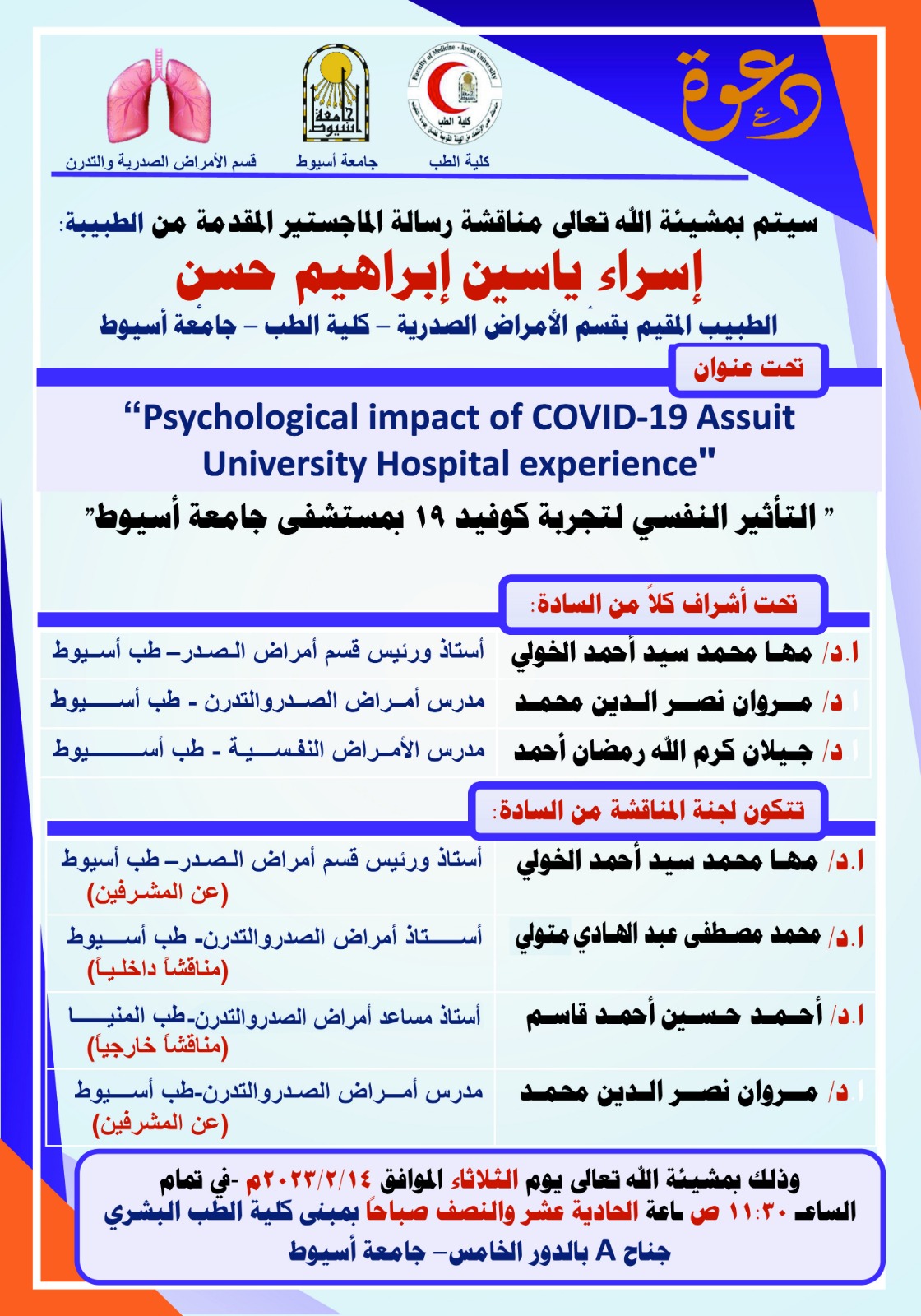 مناقشة رسالة الماجستير الخاصة بالطبيبة / إسراء ياسين إبراهيم حسن - طبيب مقيم بقسم الأمراض الصدرية - كلية الطب - جامعة أسيوط