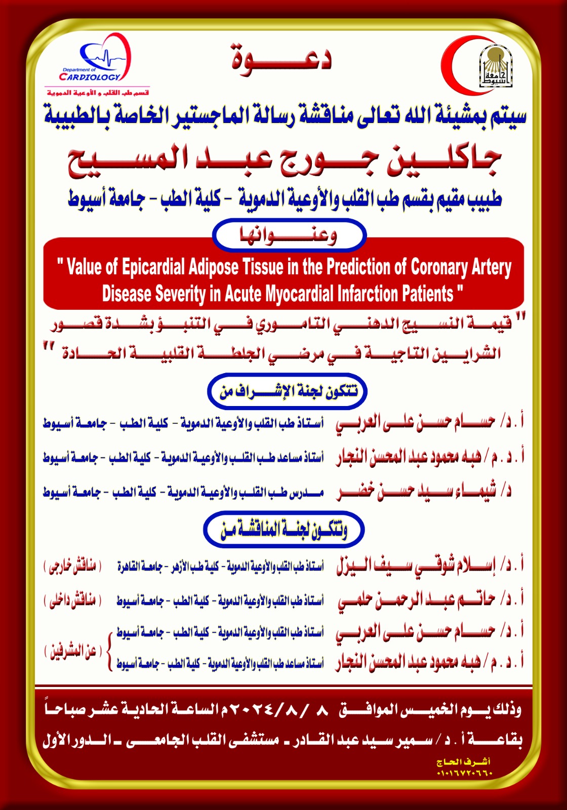 مناقشة رسالة الماجستير الخاصة بالطبيبة / جاكلين جورج عبد المسيح - طبيب مقيم طب القلب و الأوعية الدموية - كلية الطب - جامعة أسيوط