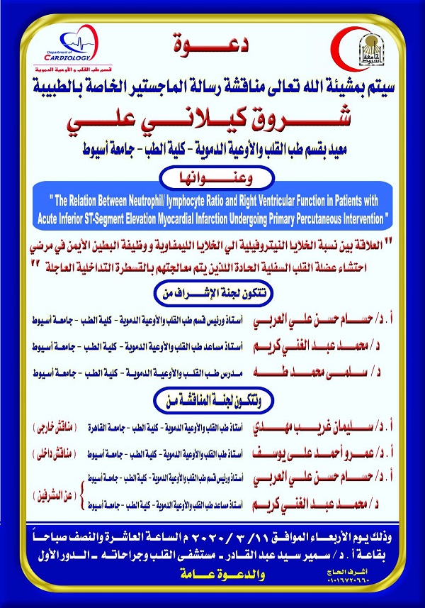 مناقشة رسالة الماجستير الخاصة بالطبيبة/ شروق كيلاني علي المعيد بقسم طب القلب والأوعية الدموية - كلية الطب - جامعة أسيوط