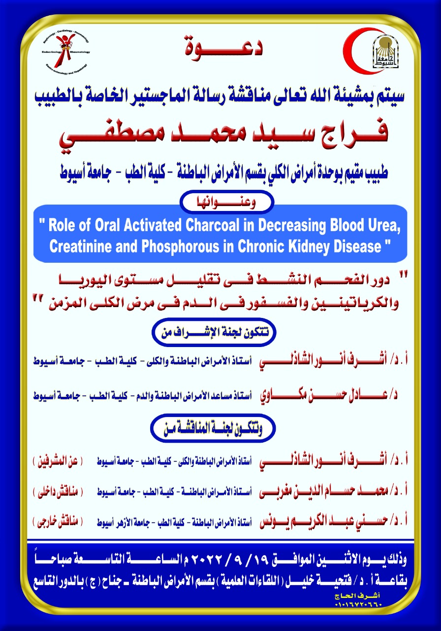 مناقشة رسالة الماجستير المقدمة من الطبيب / فراج سيد محمد مصطفى - طبيب مقيم بوحدة أمر اض الكلى بقسم الأمراض الباطنة - كلية الطب - جامعة أسيوط