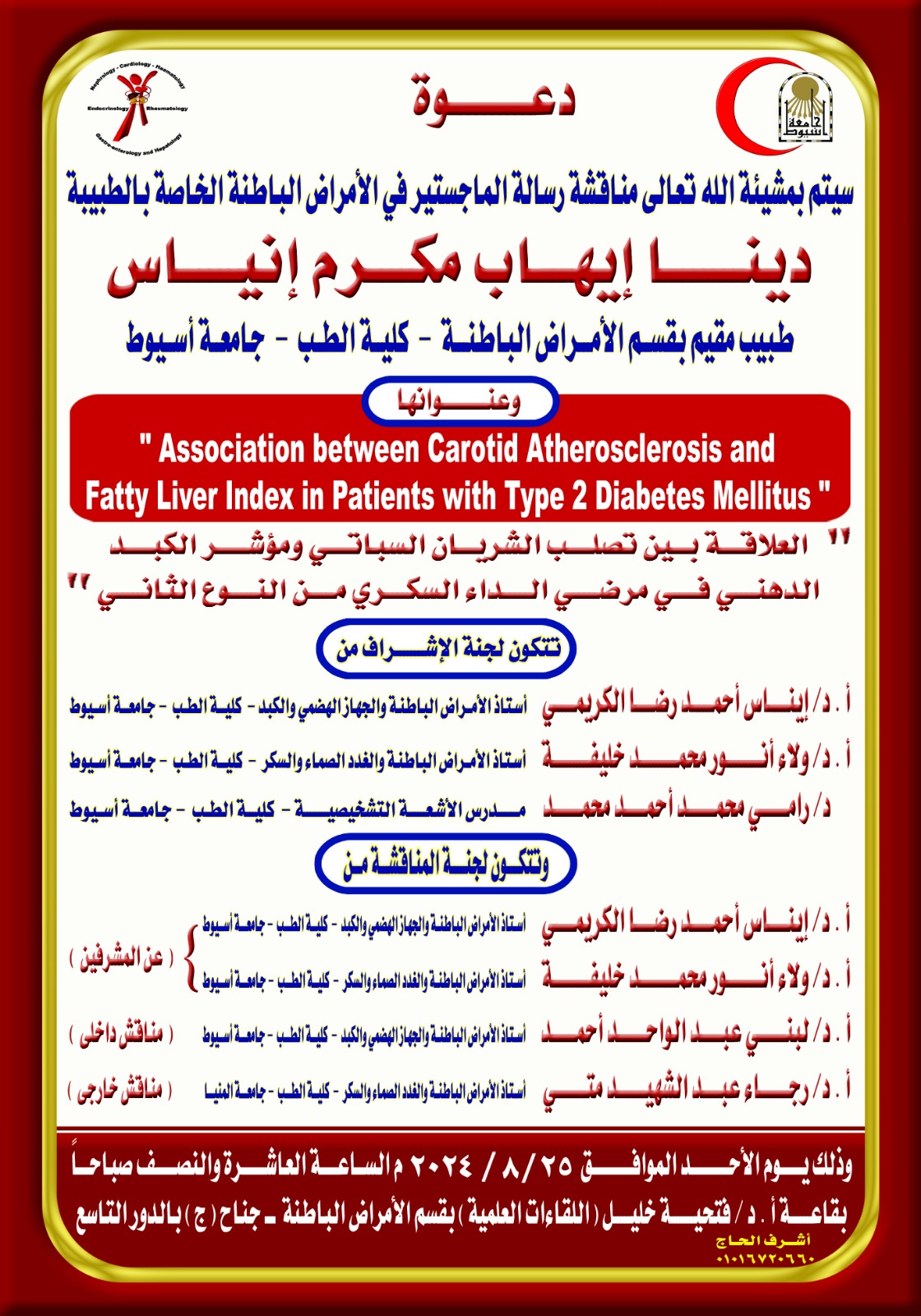 مناقشة رسالة الماجستير في الأمراض الباطنة الخاصة بالطبيبة / دينا إيهاب مكرم إنياس - طيبيب مقيم بقسم الأمراض الباطنة - كلية الطب - جامعة أسيوط