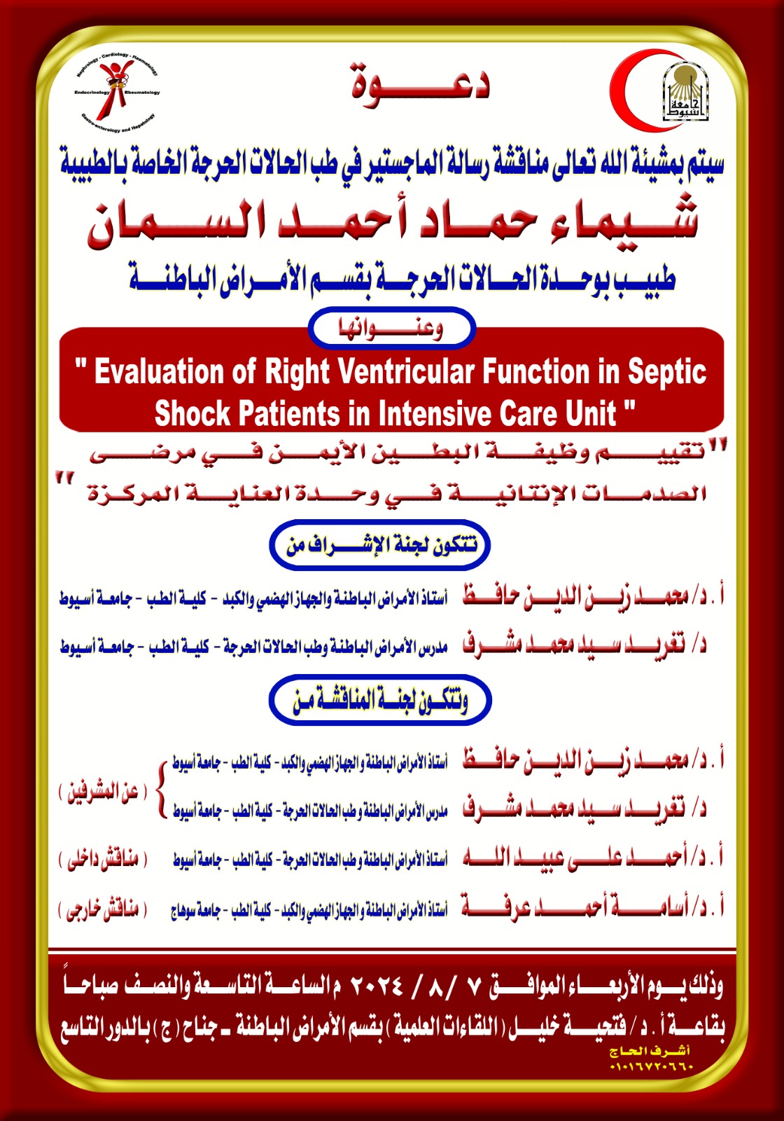 مناقشة رسالة الماجستير في طب الحالات الحرجة الخاصة بالطبيبة / شيماء حماد أحمد السمان - طبيب مقيم بوحدة طب الحالات الحرجة بقسم الأمراض الباطنة