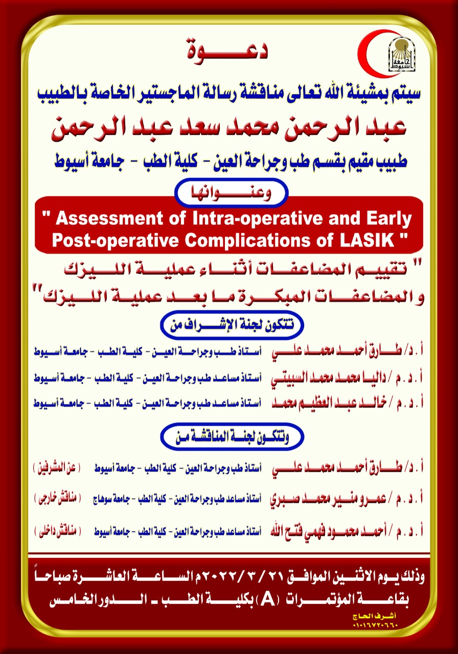 مناقشة رسالة الماجستير للطبيب / عبد الرحمن محمد سعد عبد الرحمن - طبيب مقيم بقسم طب وجراحة العين - كلية الطب - جامعة أسيوط