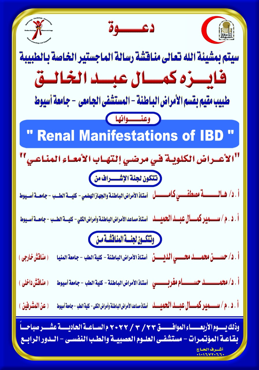 مناقشة رسالة الماجستير للطبيبة / فايزة كمال عبد الخالق - طبيب مقيم بقسم الأمراض الباطنة - المستشفى الجامعى - جامعة أسيوط