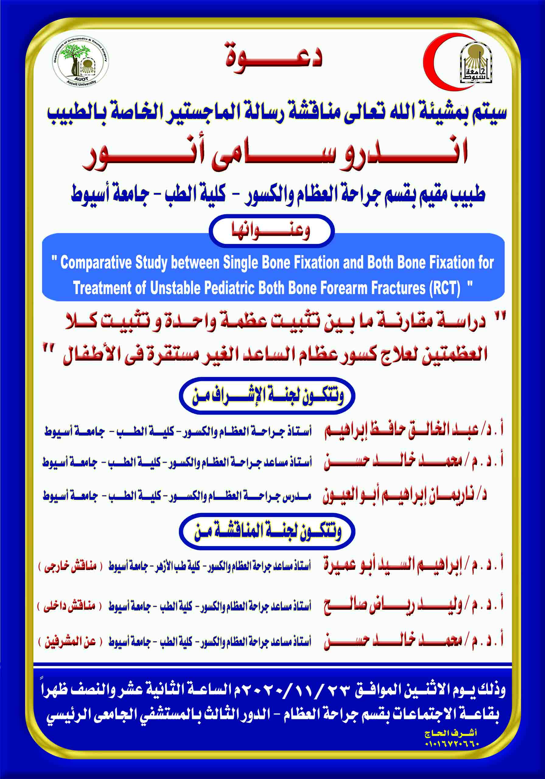 مناقشة رسالة الماجستيرالخاصة بالطبيب / اندروا سامى أنور - طبيب مقيم بقسم جراحة العظام - كلية الطب - جامعة أسيوط