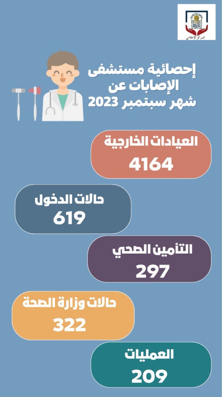 كما تم تسجيل (619) حالة دخول بالاقسام الداخلية، إلى جانب إجراء (209) عملية، بالإضافة إلى استقبال (322) حالة وزارة الصحة، و(297) حالة تأمين صحي خلال الشهر نفسه.