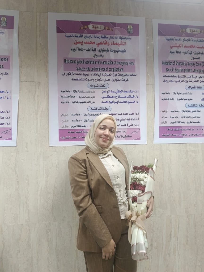 شهد مستشفى الإصابات والطوارئ بجامعة أسيوط مناقشة رسالة الماجستير المقدمة من الطبيبة الشيماء رفاعي محمد طبيب مقيم بوحدة طب الطوارئ، بكلية الطب جامعة أسيوط، تحت عنوان " استخدام الموجات فوق الصوتية في اقناء الوريد تحت الترقوى في غرفة الطوارئ، معدل النجاح وحدوث المضاعفات"