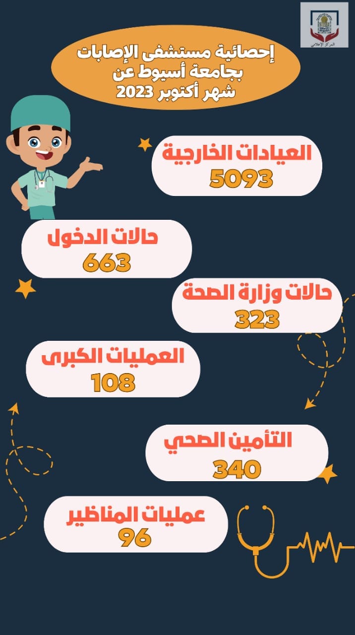 مستشفى الإصابات والطوارئ بجامعة أسيوط يستقبل (٥٠٩٣) متردداً على العيادات الخارجية خلال أكتوبر الماضي