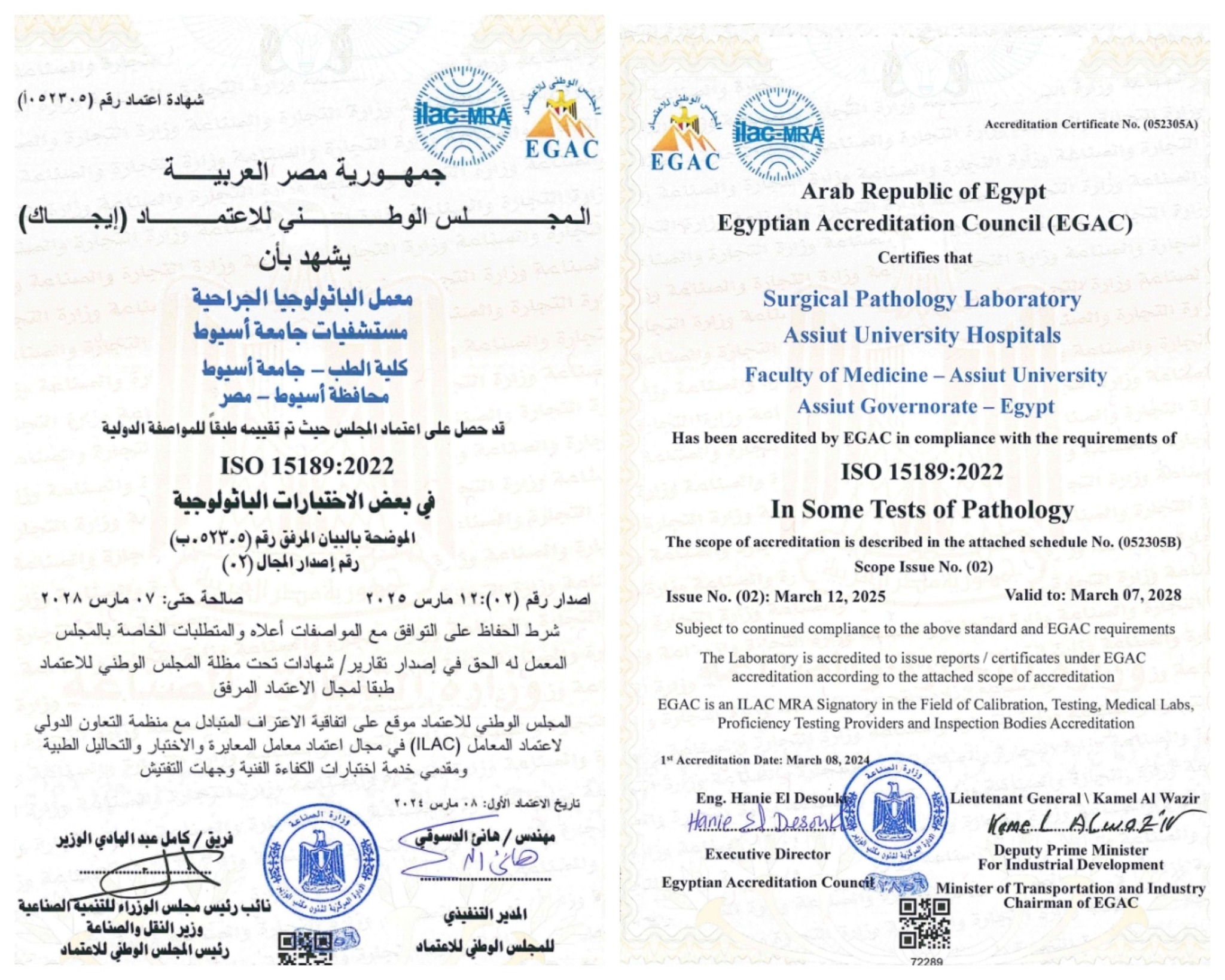 في خطوة تعكس إلتزامها الراسخ بأعلى معايير الجودة والكفاءة، أعلنت مستشفيات جامعة أسيوط برئاسة الأستاذ الدكتور أحمد المنشاوي رئيس الجامعة، والأستاذ الدكتور علاء عطية عميد كلية الطب ورئيس مجلس إدارة المستشفيات الجامعية، عن حصول معمل الباثولوجيا الجراحية التابع لها على شهادة الاعتماد رقم 15189/22، من المجلس الدولي للاعتماد "إيجاك" (EGAC).