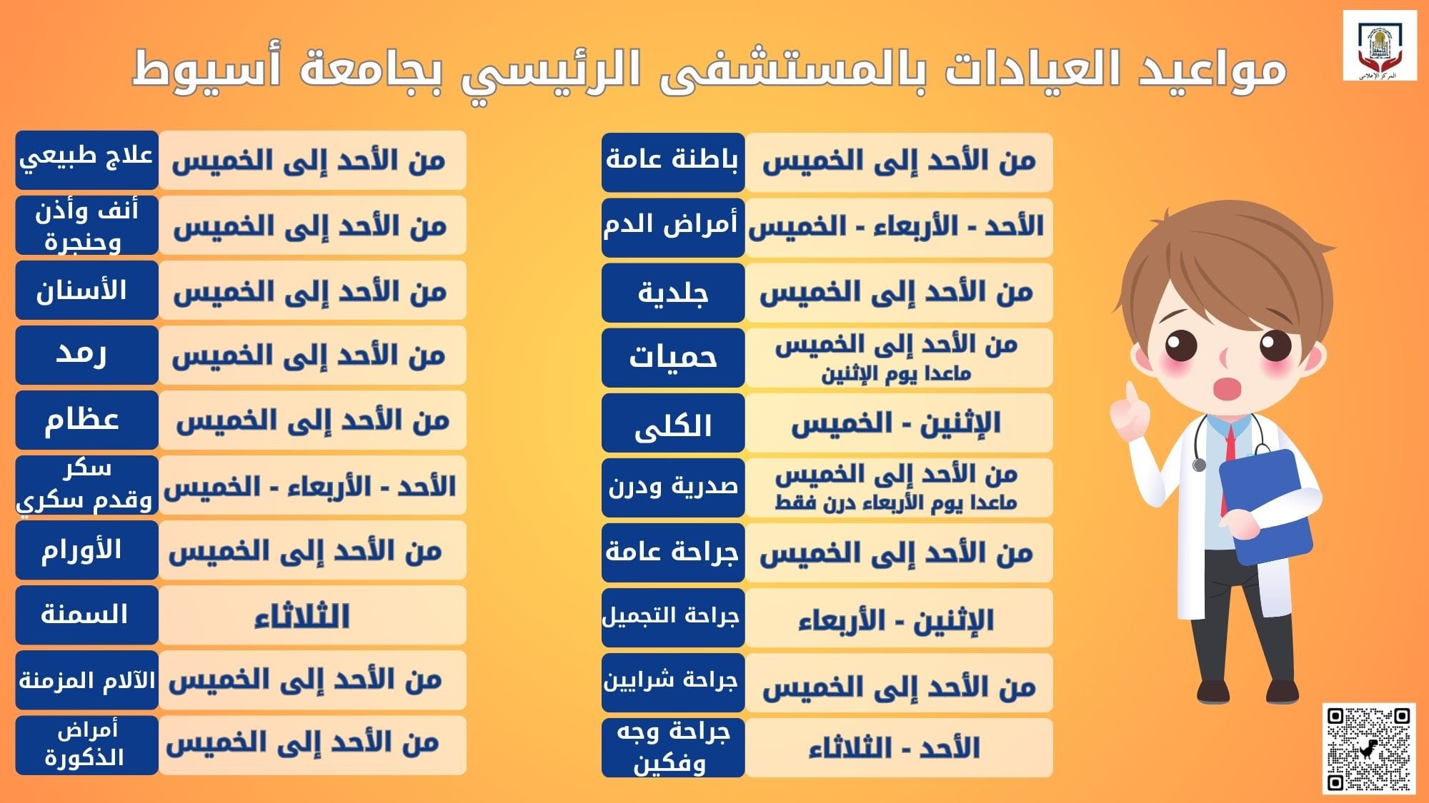 مواعيد العيادات بالمستشفى الرئيسي بجامعة أسيوط 12 مايو 2024 مواعيد العيادات بالمستشفى الرئيسي بجامعة أسيوط