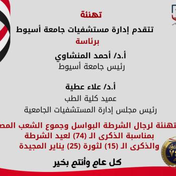 مستشفيات جامعة أسيوط تقدم التهنئة لرجال الشرطة في عيدهم الـ (٧٤) المصدر: المركز الإعلامي لمستشفيات…