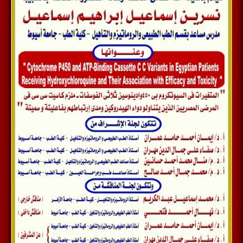مناقشة رسالة الدكتوراه الخاصة بالطبيبة / صابرين رفعت محمود عبد الملك - مدرس مساعد بقسم الأمراض الباطنة والروماتيزم - كلية الطب - جامعة أسيوط