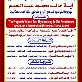 مناقشة رسالة الماجستير الخاصة بالطبيبة / آية خالد محمود عبد النعيم - معيد بوحدة الطب النووى بقسم علاج الأورام والطب النووى - كلية الطب - جامعة أسيوط